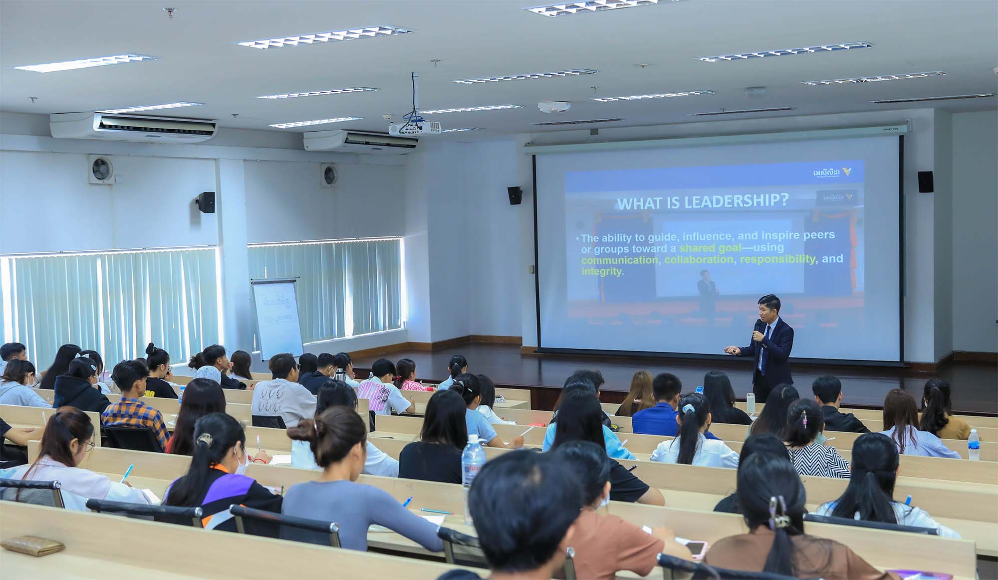 On the morning of Saturday, July 5, 2025, the Faculty of Arts, Humanities, and Languages hosted a workshop under the titled of "The Languages of Leadership" that presented by, Mr. Thab Chanthorn, the Dean of the Faculty of Arts, Humanities and Languages. This workshop was conducted with the purpose of sharing the language of the leadership to participants including lecturers, teachers and students who are currently studying EAP program and associate and bachelor’s degree of English major.