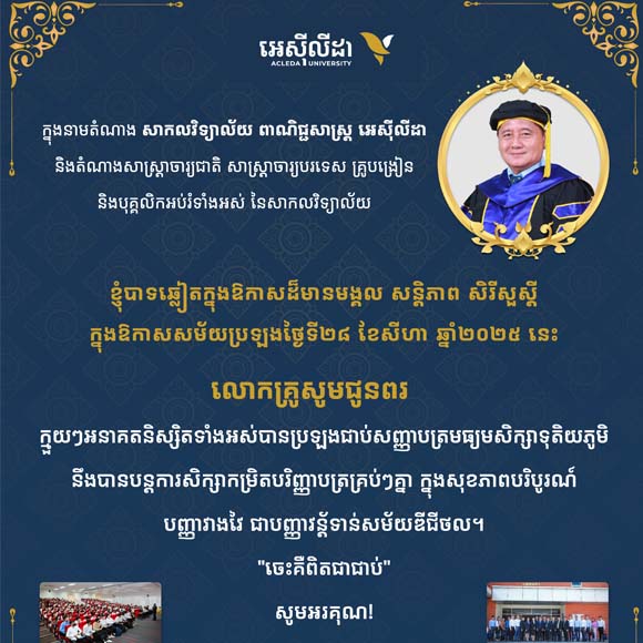 សាកលវិទ្យាល័យ ពាណិជ្ជសាស្ត្រ អេស៊ីលីដា (ACLEDA University of Business) មានមោទនភាពយ៉ាងខ្លាំងក្នុងការបង្ហាញនិស្សិតឆ្នើមពីររូប៖ លោក តូច ឥនសុភា (និស្សិតវិទ្យាសាស្ត្រ និងវិស្វកម្មកុំព្យូទ័រ) និង កញ្ញា ឈិត ហេឡែន (និស្សិតបច្ចេកវិទ្យាព័ត៌មានធុរកិច្ច)...