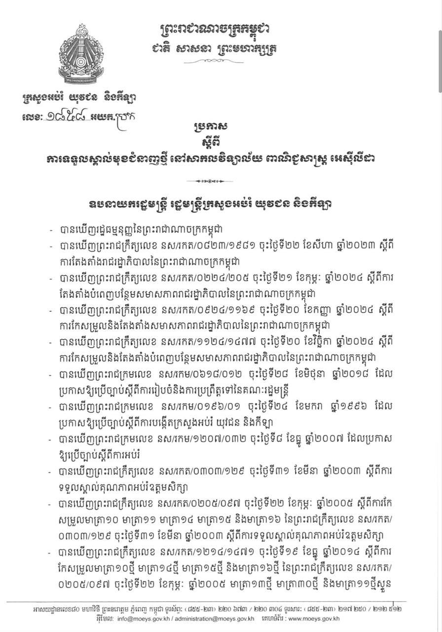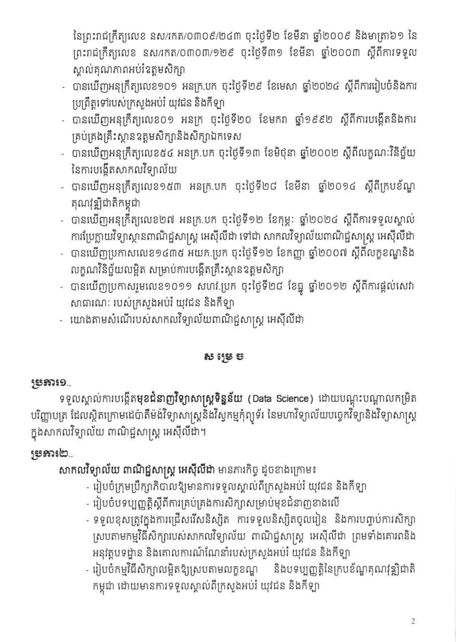 ក្រសួងអប់រំ យុវជន និងកីឡា បានចេញប្រកាសអនុញ្ញាតលើការបង្កើត និងដាក់ឲ្យប្រើប្រាស់លើជំនាញសិក្សាថ្មី ជូនដល់សាកលវិទ្យាល័យ ពាណិជ្ជសាស្រ្ត អេស៊ីលីដា គឺ "វិទ្យាសាស្ត្រទិន្នន័យ (Data Science)"