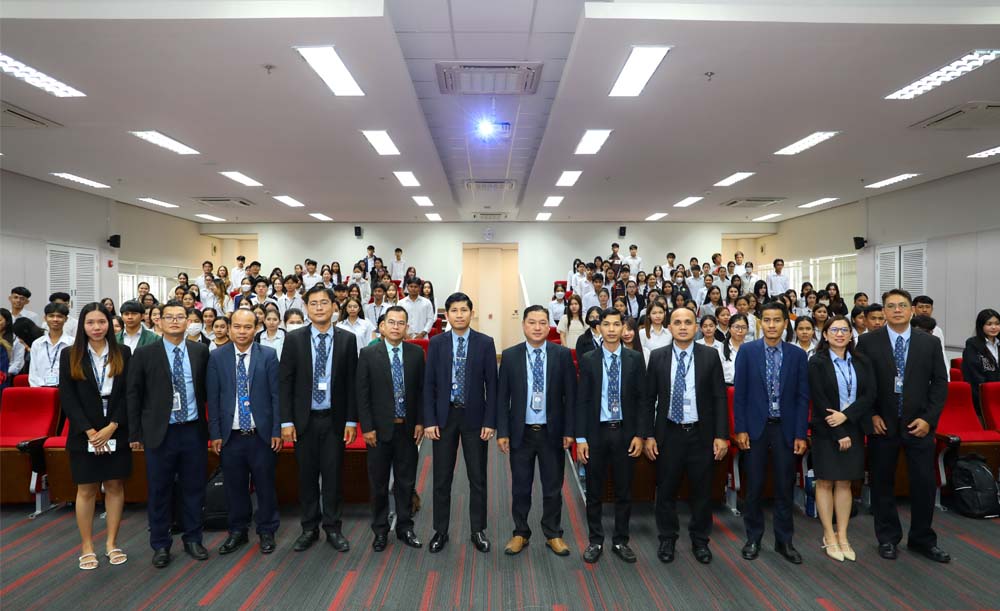 On the afternoon of November 17, 2025, Faculty of Arts, Humanities, and Languages hosted a meeting between the FAL management team and the English for Academic Purposes (EAP) students, approximately 200. This meeting, highly presented by Mr. Thab Chanthorn, the Dean of Faculty of Arts, Humanities, and Languages along with the faculty members, aimed to share the students the effective learning methods and the benefits of foreign languages, particularly English and Chinese, which are the crucial languages of job market demands.